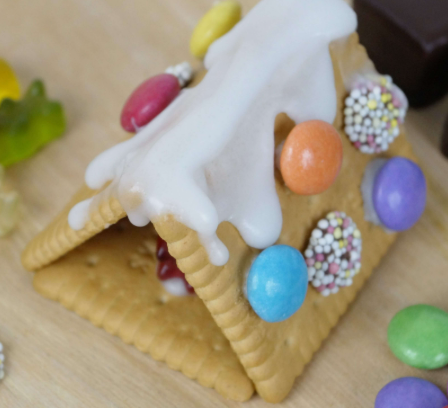 Ihr braucht 3 Butterkekse, Zuckerguss und leckere Sachen zum Dekorieren (Smarties, Gummibärchen, etc.). Verbindet die 3 Kekse wie unten auf dem Bild mit Zuckerguss miteinander. 1 Keks ist der Boden, die anderen beiden bilden das Dach. Nun dekoriert das Haus mit Zuckerguss und Süßigkeiten. Fertig! Lasst es euch schmecken 🙂 Eignet sich auch super als kleines Geschenk!