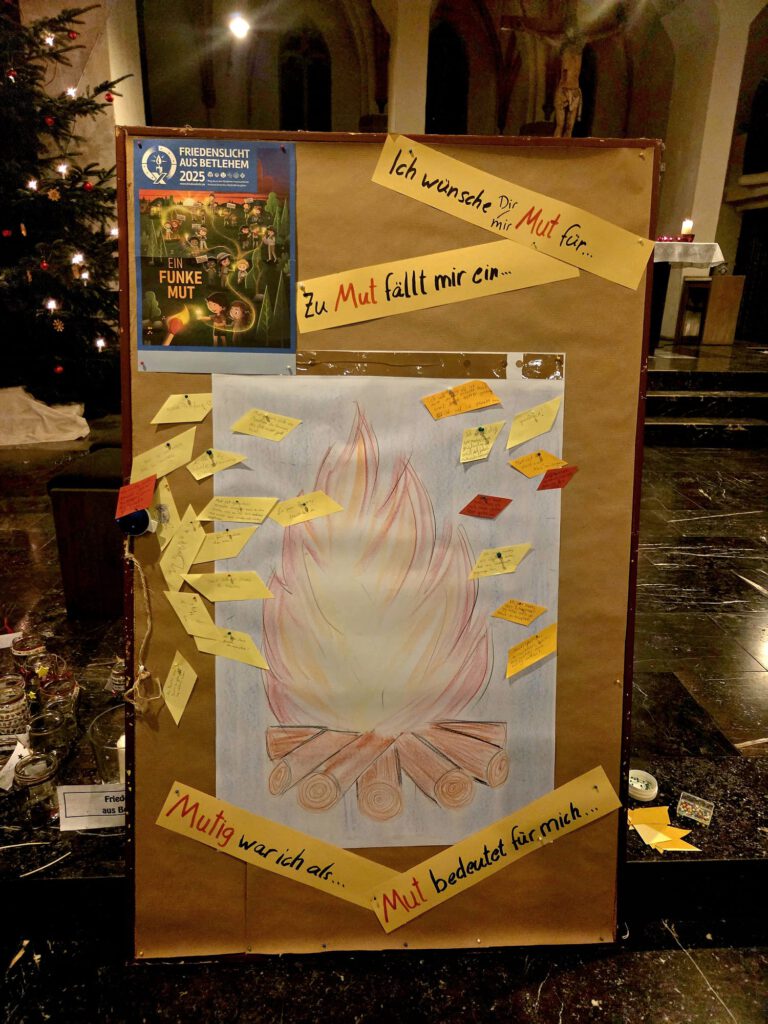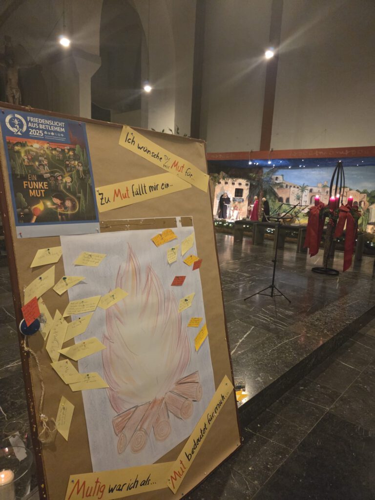 Am 20.12. haben wir im Rahmen des Familiengottesdiensts in der Kirche in Siersdorf das Friedenslichtthema: „Ein Funke Mut“ thematisiert und das Friedenslicht weiter gegeben. Bei anschließendem Kakao und Keksen haben wir den Tag ausklingen lassen.