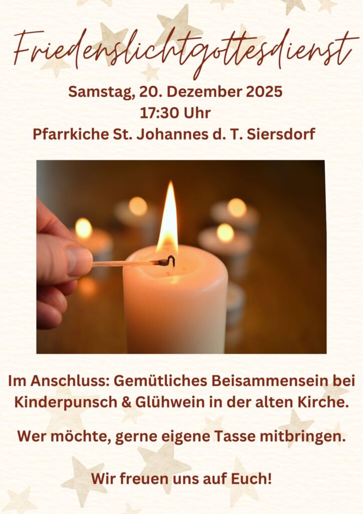 Am 20.12.2025 um 17:30 Uhr findet der Familiengottesdienst in der Kirche St. Johannes in Siersdorf statt. Dort wird das Friedenslicht weiter verteilt und im Anschluss gibt es Kakao, Glühwein und Gebäck. Kommt gern vorbei!